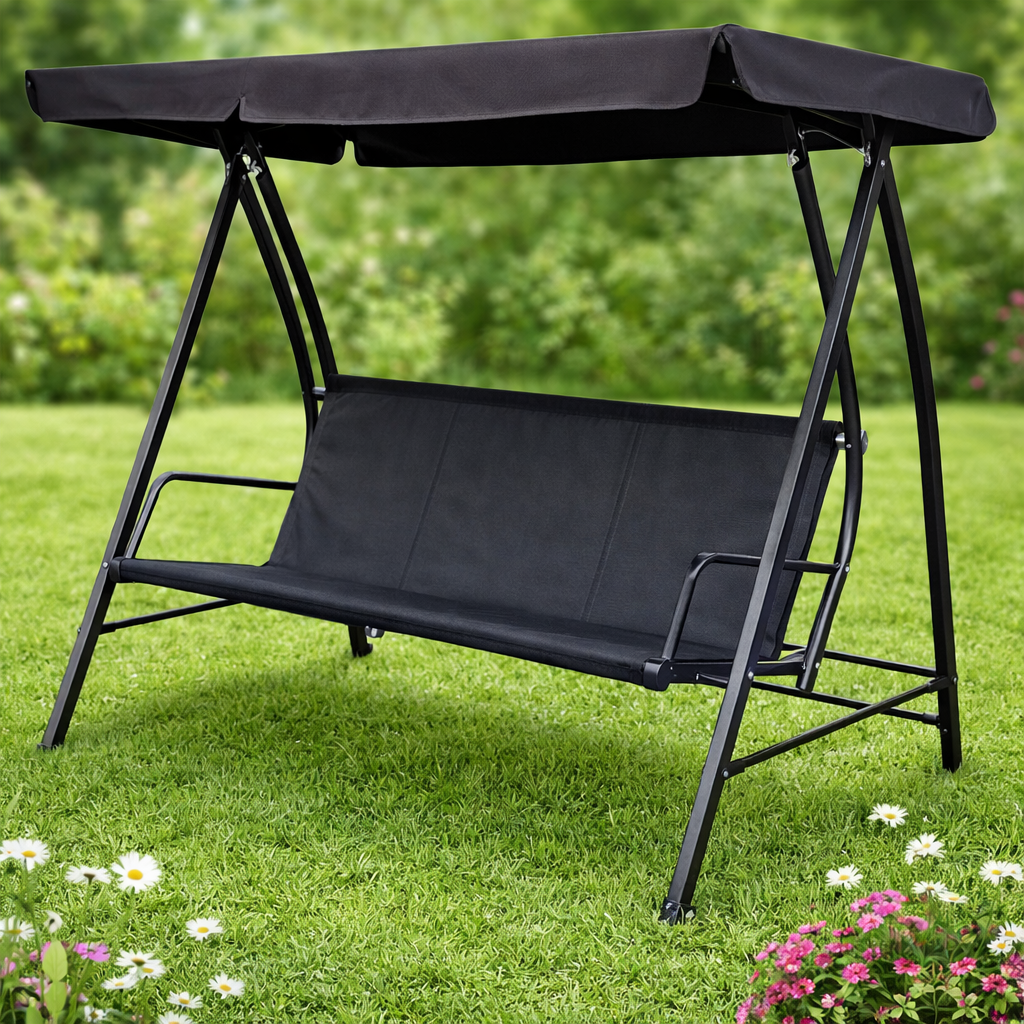 Balancelle de luxe trois places avec assise en textilène, assise en tissu textilène, auvent en tissu polyester 180 g F72 - Structure noire 268 - Tissu textilène noir 2x1